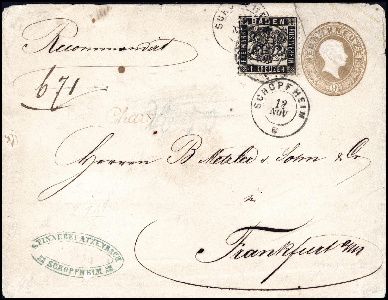 1 Kr. schwarz, besonders tieffarbiges Kabinettstück mit klarem K2 SCHOPFHEIM als Zusatzfrankatur auf rekommandiertem Großformat-Ganzsachenumschlag 9 Kr. braun nach Frankfurt/M. Eine einmalige Marken-Ganzsachen-Kombination, welche trotz