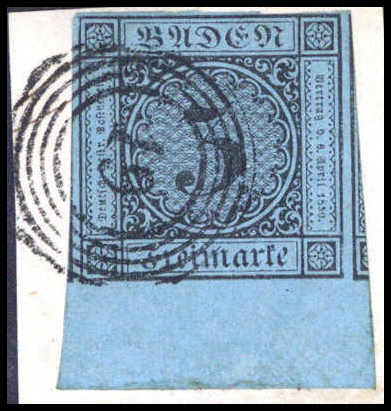 3 Kr., bis auf kl. Stelle perfekt geschnittenes Exemplar mit 9 mm großem Bogenrand unten auf Bfstk. (li. und re. Teile der Nebenmarken), klarer Stempel "19" BRUCHSAL, sign. Bühler