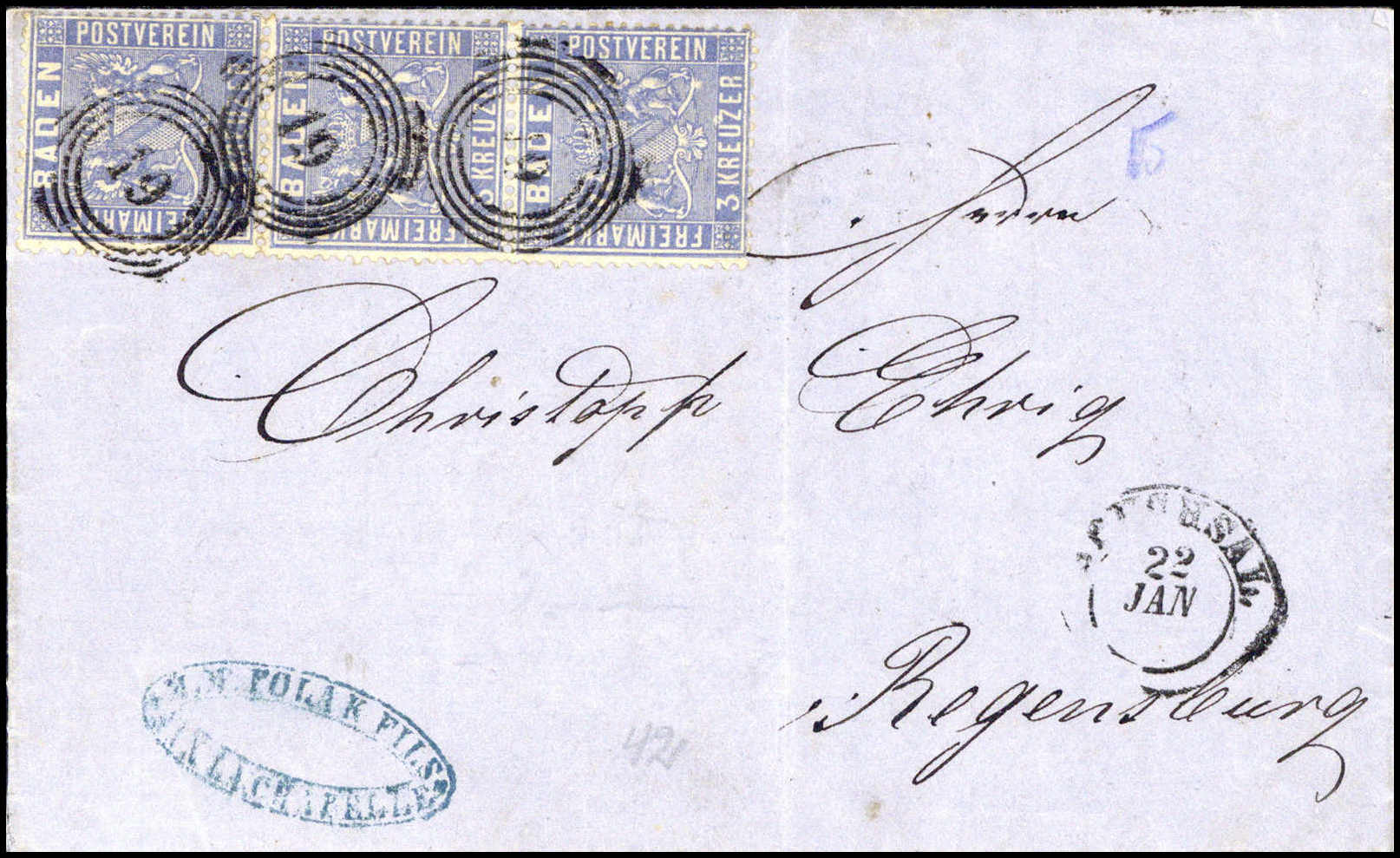 3 Kr., senkr. Kabinett-Dreierstreifen mit klaren Stempeln "19" BRUCHSAL auf sauberem Brief nach Regensburg
