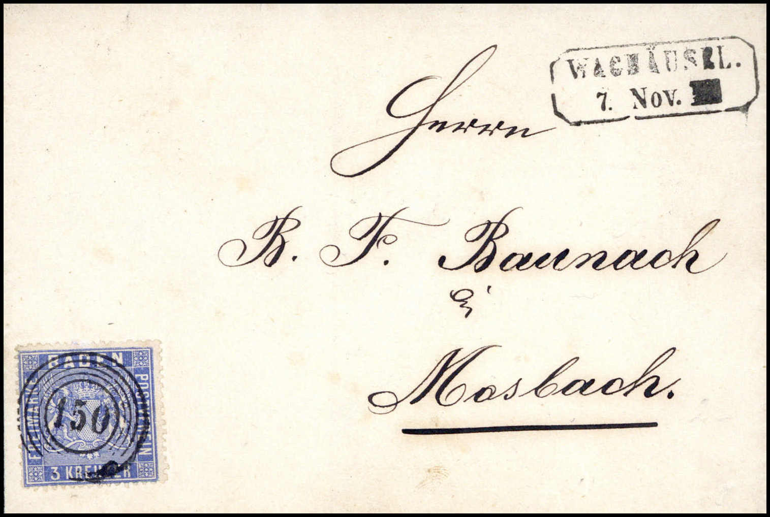 3 Kr., aktenfrischer, weißer Luxusbrief mit idealem Stempel "150" WAGHÄUSEL nach Mosbach