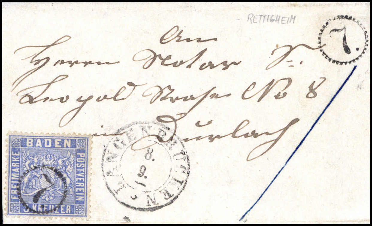 3 Kr., vollzähniges Kabinettstück mit fast zentr. Stempel "109" PFORZHEIM auf gef. Brief nach Karlsruhe. Katalogpreis: 250,-