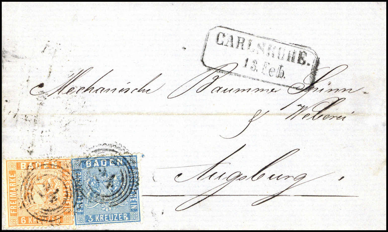 3 Kr. mit 6 Kr. lachsrot, schöne Buntfrankatur mit zentr. Zackenkranzstpl. "24" KARLSRUHE auf Faltbrief nach Augsburg. 3 Kr. kleine Mängel