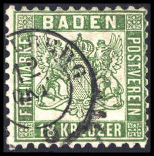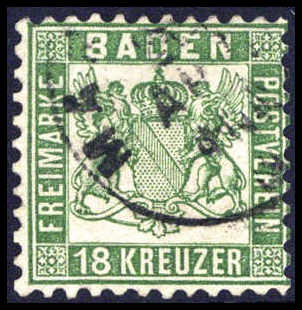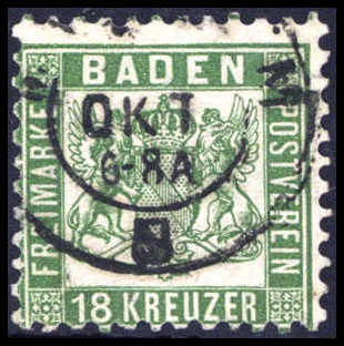 18 Kr. dunkelopalgrün, schönes, besonders tieffarbiges Exemplar mit klaren K2 MANNHEIM, re. oben ein Fehlzahn. Atttraktives Stück dieser seltenen Marke. Katalogpreis: 3.000,-