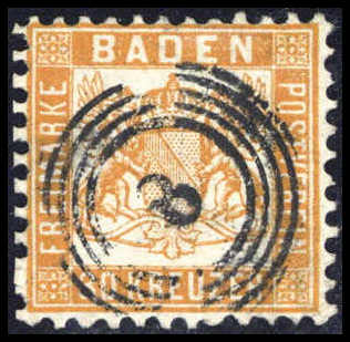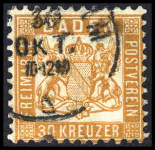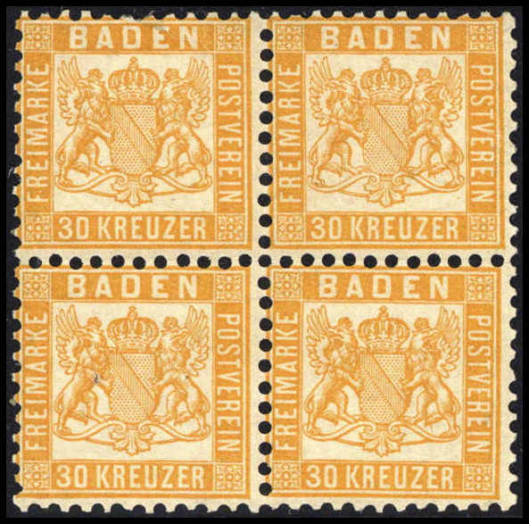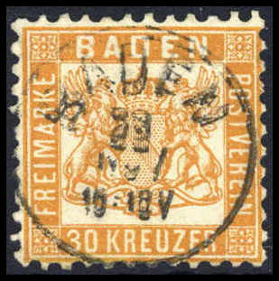 30 Kr., ausgezeichnetes Exemplar in perfekter Zähnung und Zentrierung sowie leuchtend frischer Farbe, klar und zentr. aufgesetzter Stempel "8" BADEN. Bis auf ein winz. gestützten Eckzahn in völlig tadelloser Erhaltung, Fotoattest Brettl