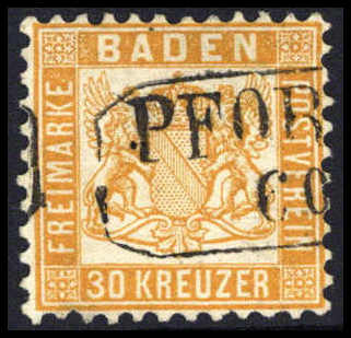 30 Kr., außergewöhnlich farbfrisches Luxusstück in hervorragender Zähnung und mit sauber aufges. R2 PFORZHEIM. Ausnahme-Exemplar für hohe Ansprüche, Fotoattest Stegmüller BPP ("Tadellose Erhaltung, ein dekoratives Exemplar"). Katalogpreis: 3.000,-+