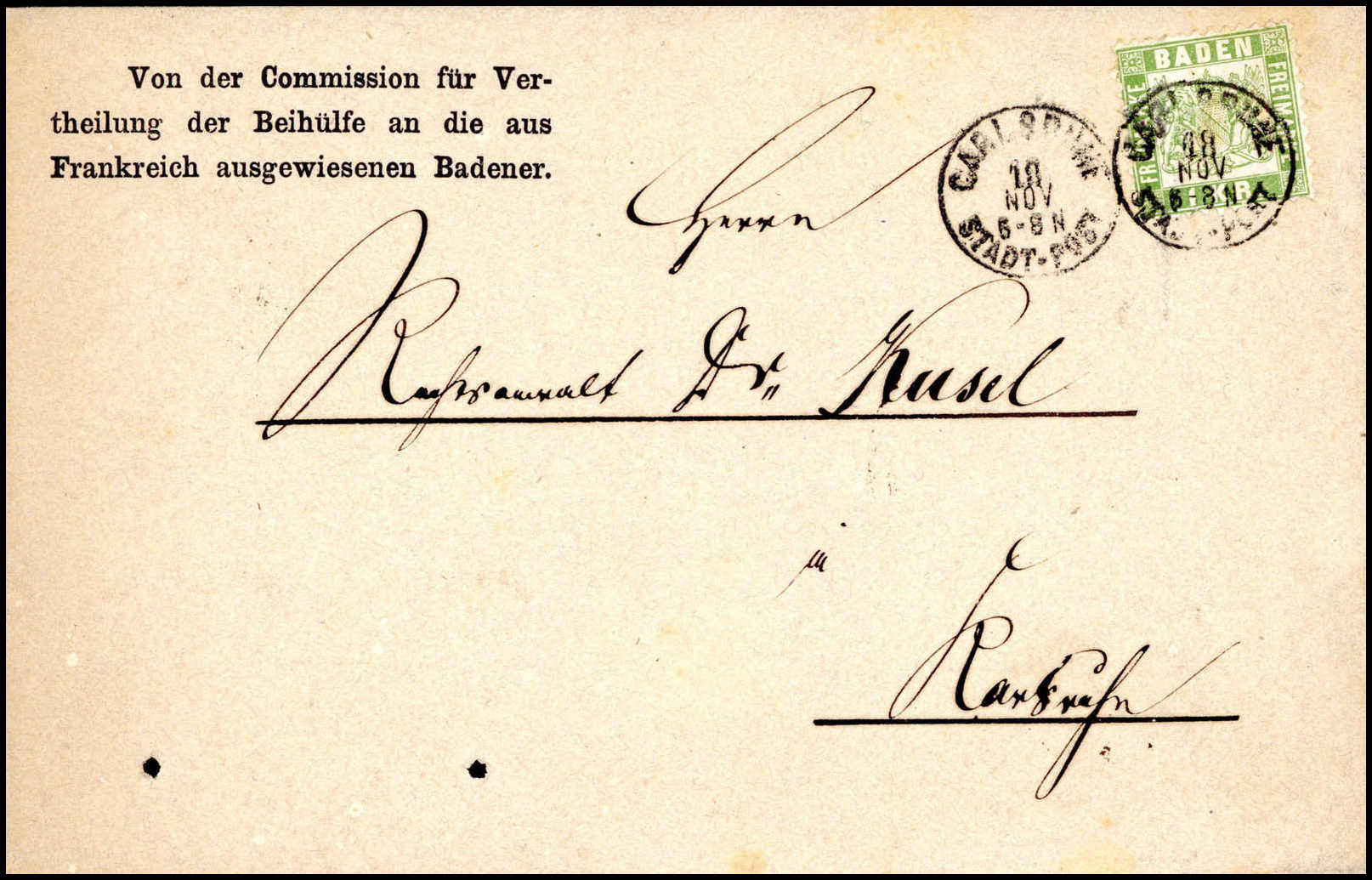1 Kr., EF auf Vordruckumschlag "Von der Commission für Vertheilung der Beihülfe an die aus Frankreich ausgewiesenen Badener" an Rechtsanwalt Dr. Kusel in Karlsruhe (unten zwei Aktenstiche). Ein interessanter Beleg