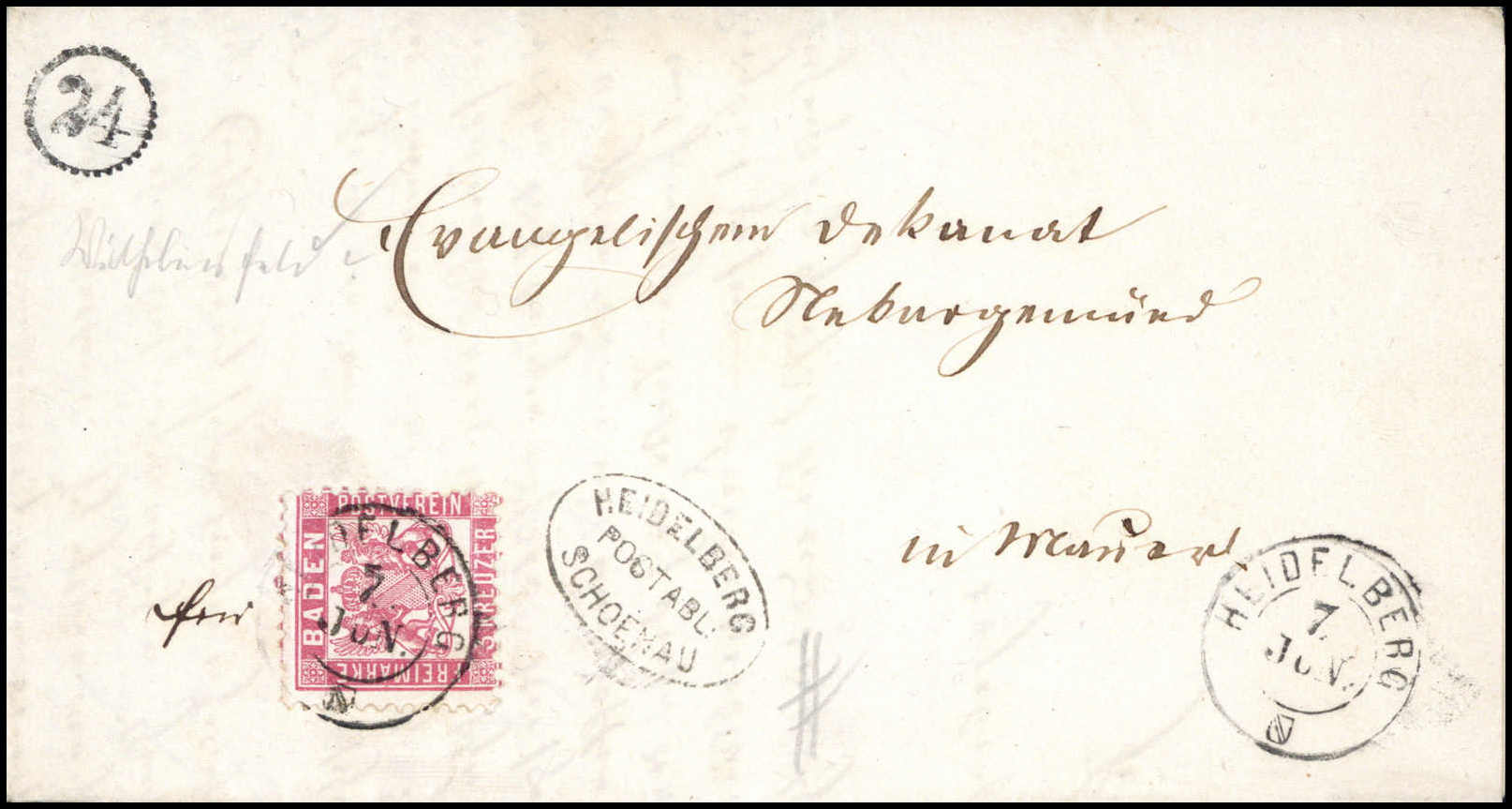 1646 18 image"24", klar beiges. auf Luxusbrief 3 Kr. mit K2 HEIDELBERG und Postablagestpl. SCHOENAU