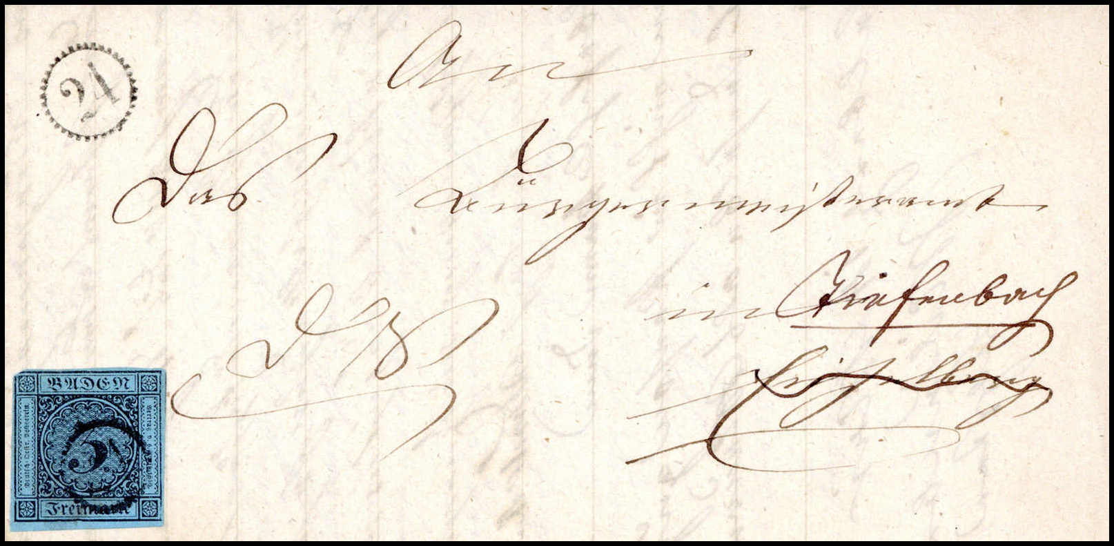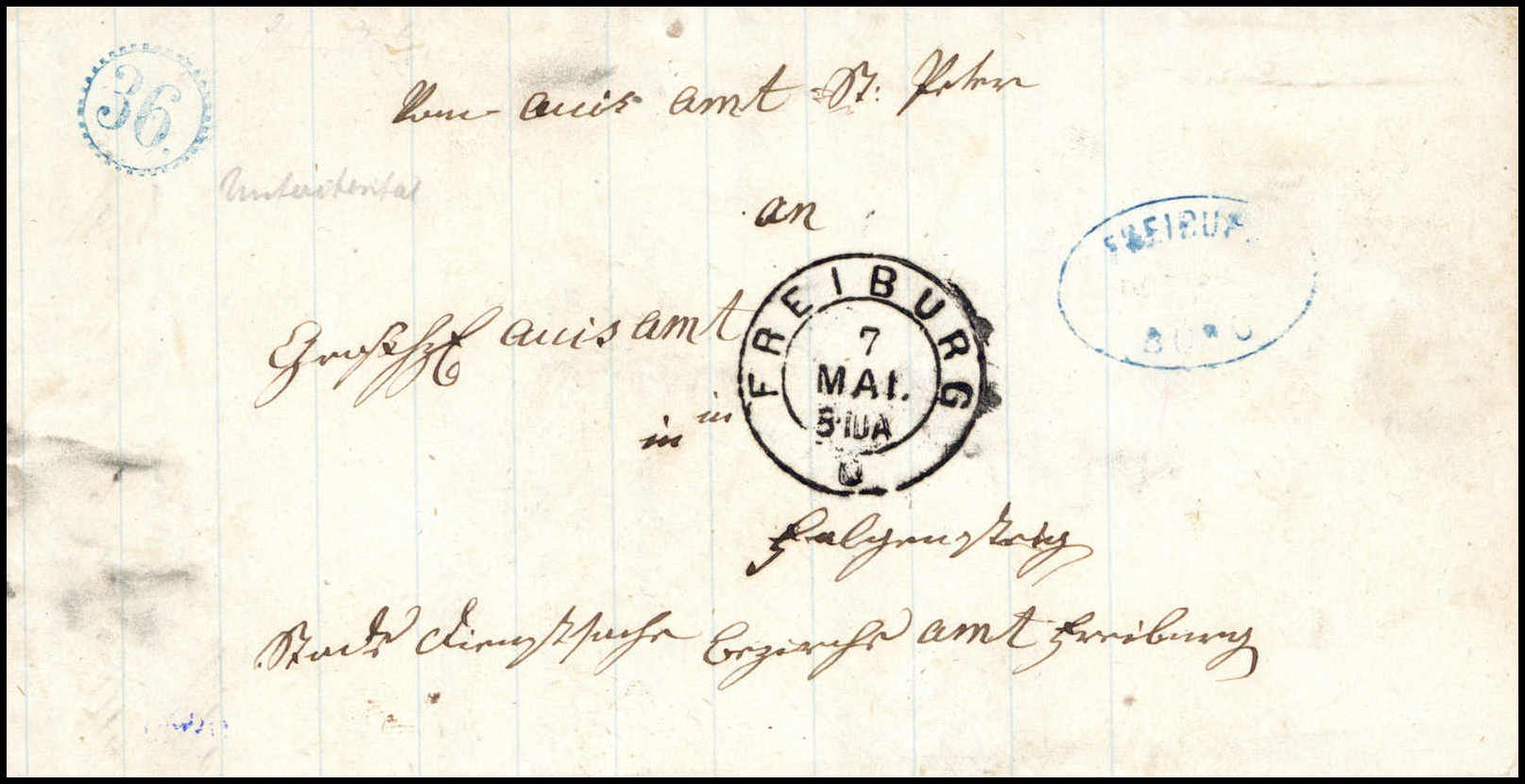 1648 image"36" und Postablagestpl. FREIBURG/BURG, beide in Blau mit K2 FREIBURG auf Dienstbrief nach Fleckensteig