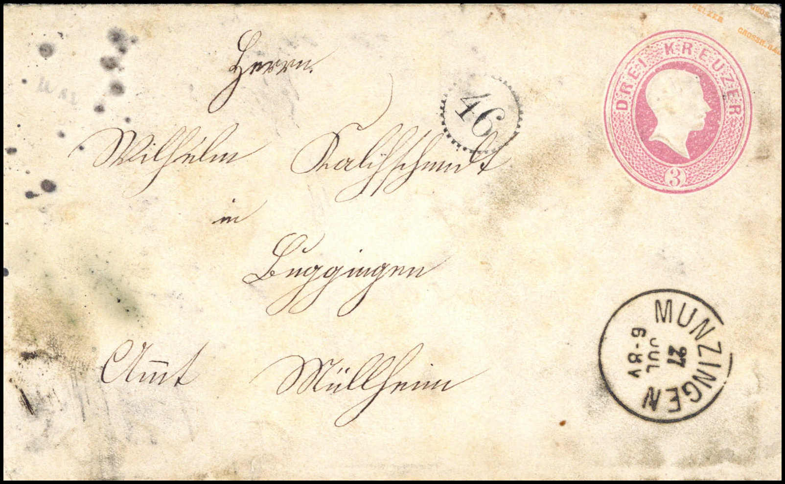 1651 U12 image"46", klar beiges. auf etwas defektem Ganzsachenumschlag 3 Kr. mit K1 MUNZINGEN