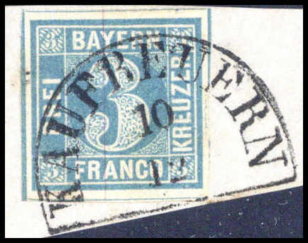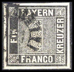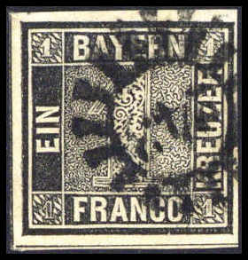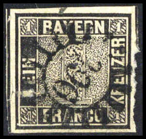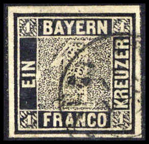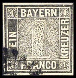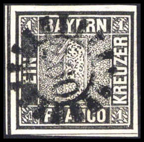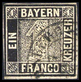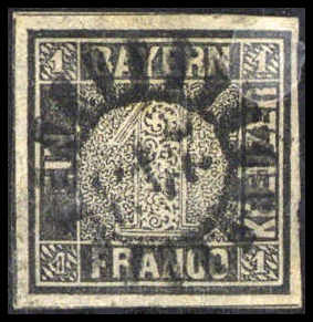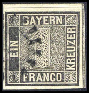 1 Kr. schwarz, Platte 2, besonders tieffarbiges Kabinettstück, ringsum breitrandig geschnitten und mit fast zentr. MR "243" NÜRNBERG entwertet. Vorzügliches Stück, Fotoattest Stegmüller BPP. Katalogpreis: 3.500,-