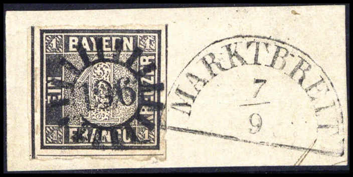 1 Kr. grauschwarz, Platte 2, wundervolles Luxus-Bfstk. mit zentr. und gestochen klarem MR "196" nebst beiges. Aufgabe-HK MARKTBREIT. Ein Idealstück des Schwarzen Einsers, Fotoatteste Brettl BPP, Stegmüller BPP. Katalogpreis: 3.500,-+
