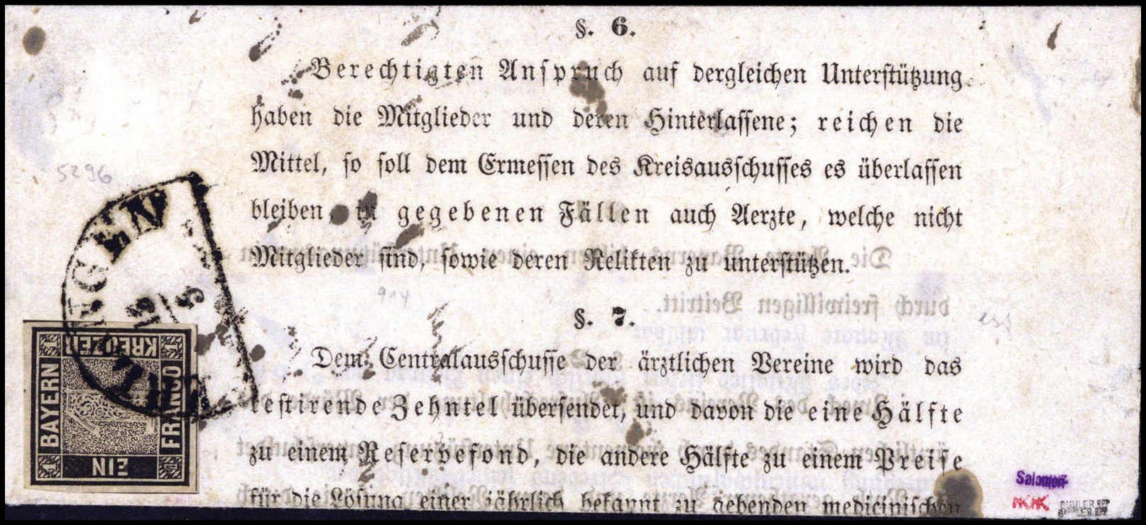 1 Kr. schwarz, Platte 2, besonders tieffarbiges, ringsum breitrandiges Exemplar mit genau zentr. MR "396" WÜRZBURG versehen. Rs. ein Spaltriss, sonst in tadelloser Erhaltung, Fotobefund Stegmüller BPP. Katalogpreis: 3.500,-