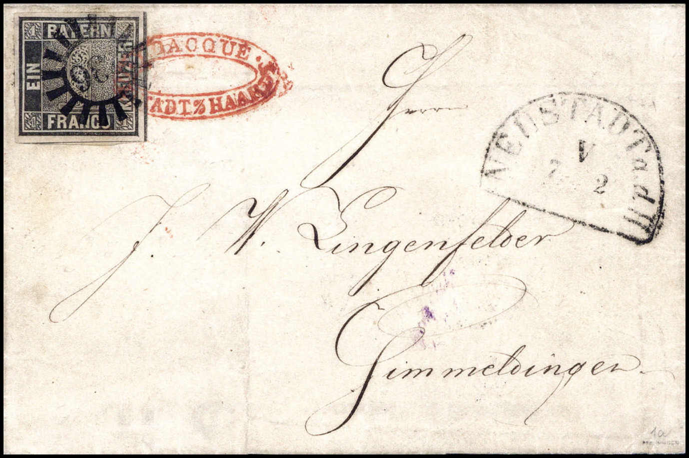 1 Kr. grauschwarz, Platte 2, ringsum gleichmäßig breitrandiges Luxusstück in ausgezeichnet frischer Farbe als Einzelfrankatur auf besonders schöner, kleiner Drucksache nach Gimmeldingen, zentr. und klarer MR "236" NEUSTADT d. a. H. Auf