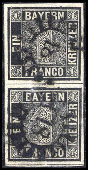 1 Kr. tiefschwarz, senkr. Paar, die untere Marke mit dem markanten Plattenfehler I (weißer Fleck in der Randlinie über "BA" von "BAYERN"), ringsum breitrandig geschnitten und in makelloser Luxus-Erhaltung. Zwei zentr. MR "18" AUGSBURG.