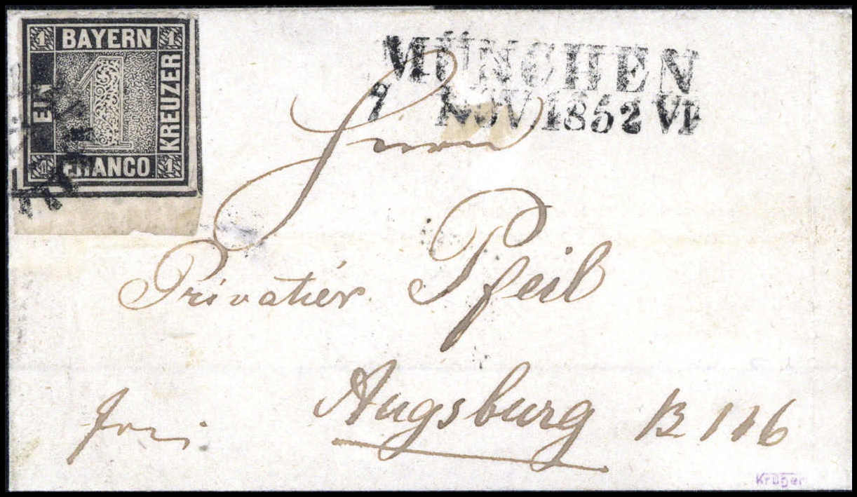 1 Kr. schwarz, Platte 2, re. unt. Bogenecke, unten mit 5 mm breitem Bogenrand, Kabinettstück als Einzelfrankatur auf reizvollem, kleinformatigem Faltbrief nach Augsburg (Briefpapier winz. Aufrauhungen). Als Bogenecke auf einem so