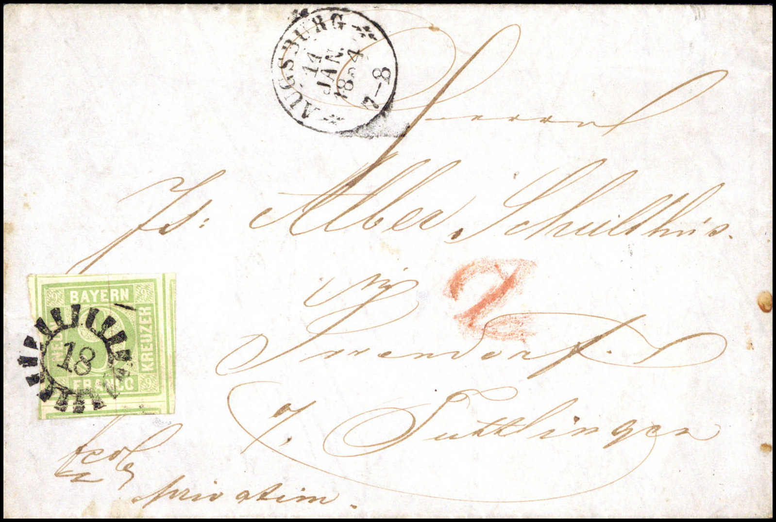 9 Kr., äußerst breitrandig auf Kabinettbrief mit kpl. Inhalt, klarer MR "18" AUGSBURG 14/1 54, Kurzbefund Brettl. Katalogpreis: 200,-