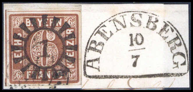6 Kr., Luxus-Bfstk. mit ideal klar und gerade aufsitzendem MR "1" unb beiges. HK ABENSBERG