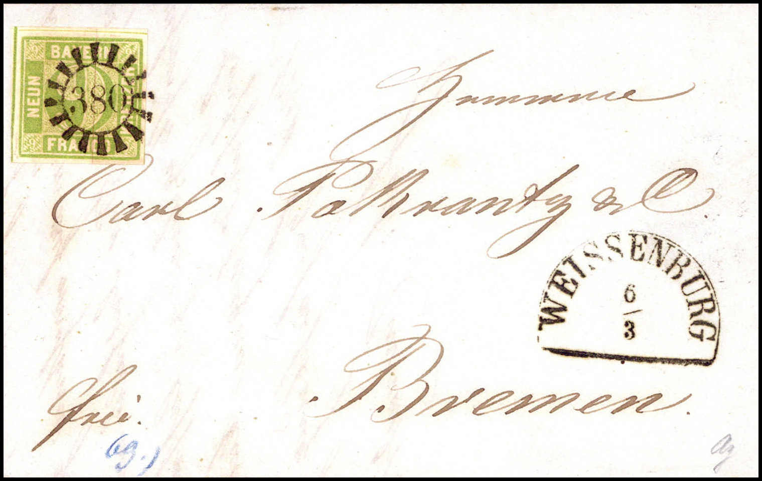 9 Kr., besonders schöner Luxusbrief mit idealem MR "380" WEISSENBURG
