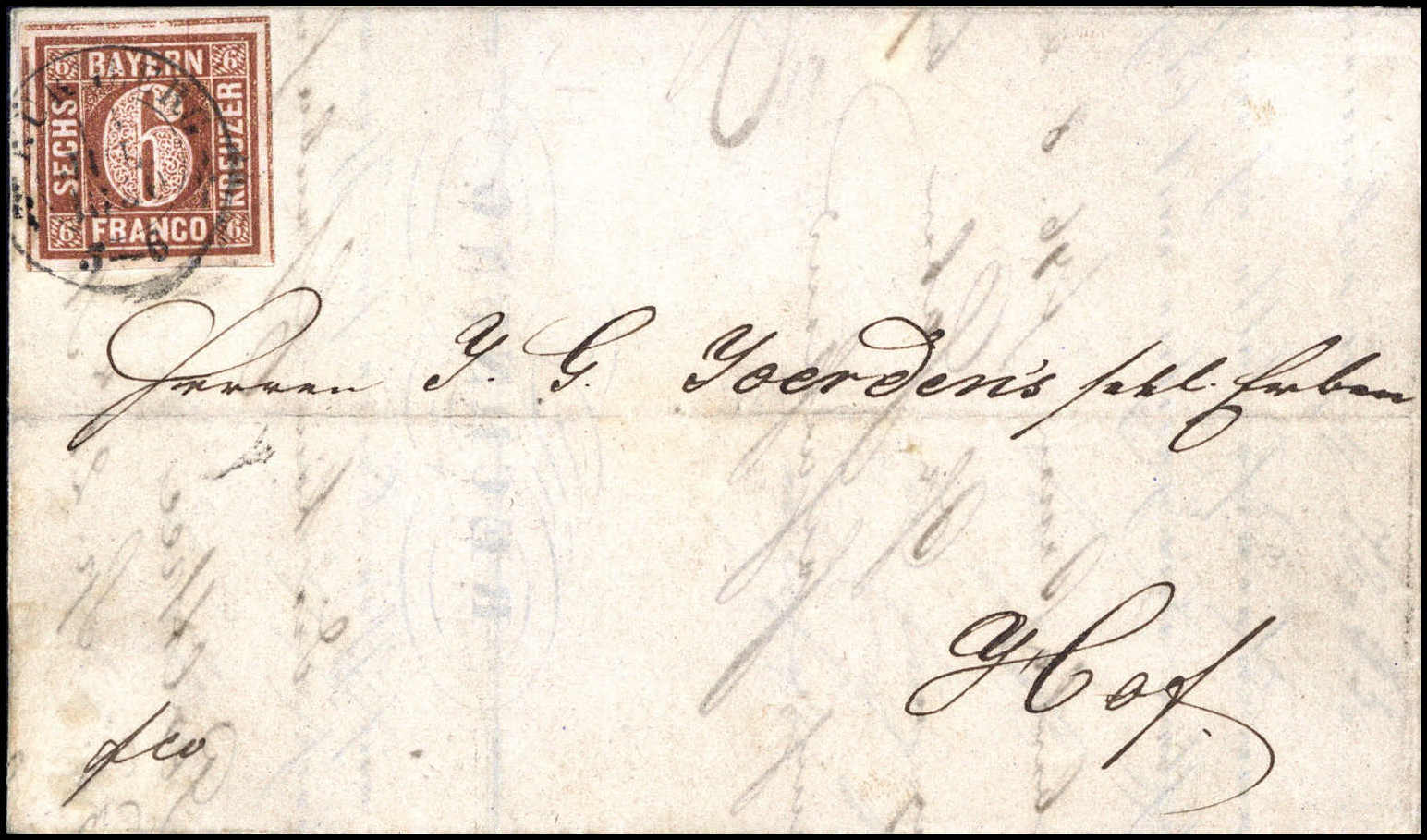 6 Kr., Kabinettstück mit fast zentr. K2 NÜRNBERG auf kl. Faltbrief nach Hof. Katalogpreis: 800,-