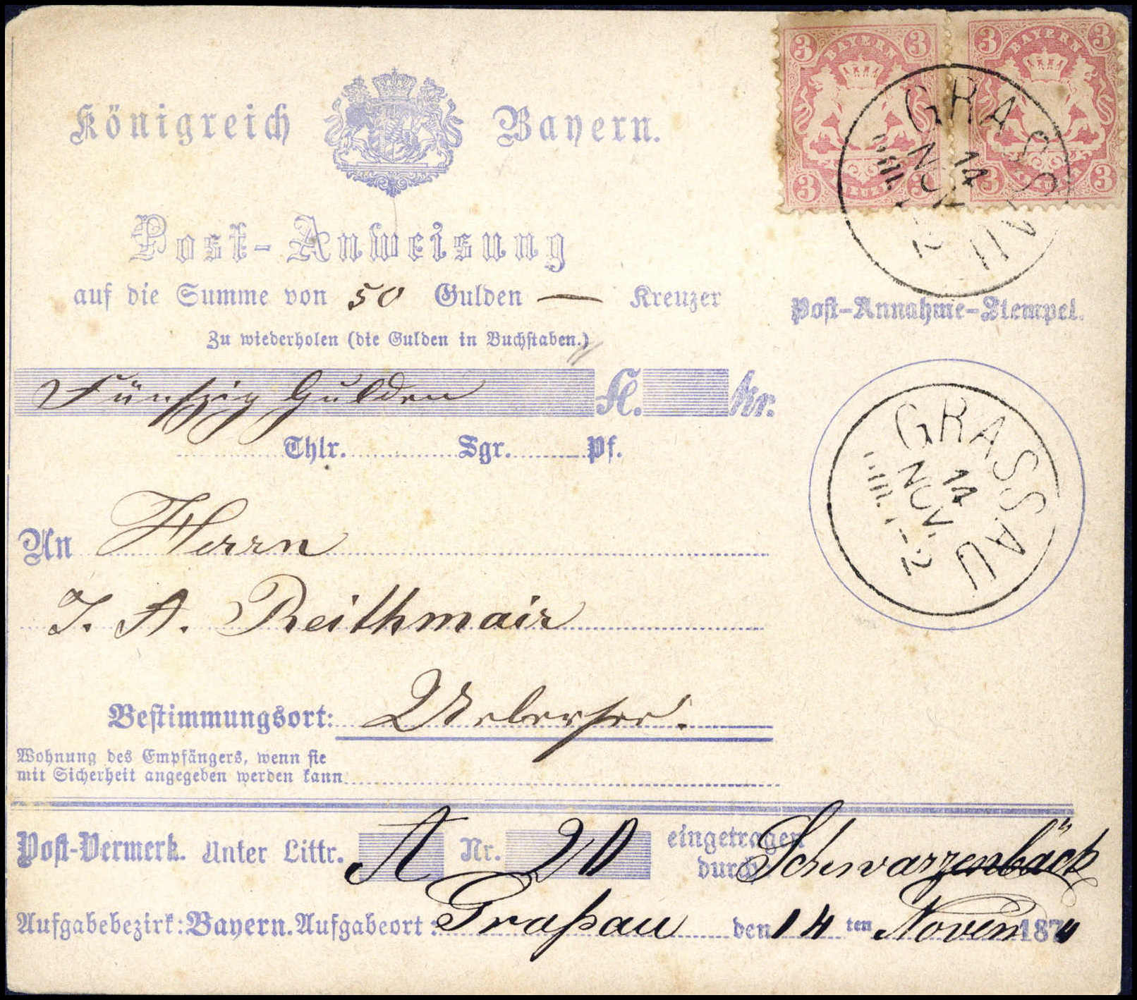 3 Kr., zwei Exemplare (kl. Beanstdg.) auf Postanweisung über 50 Gulden nach Uebersee, klare K1 GRASSAU 14/11 (1874). Postanweisungen aus der Kreuzerzeit sind selten, Fotoattest Brettl