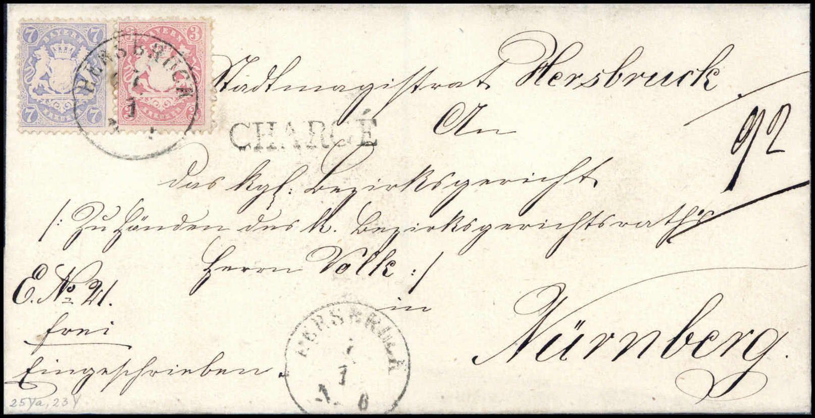 3 und 7 Kr., aktenfrischer Luxus-Chargébrief mit klarem K1 HERSBRUCK nach Nürnberg