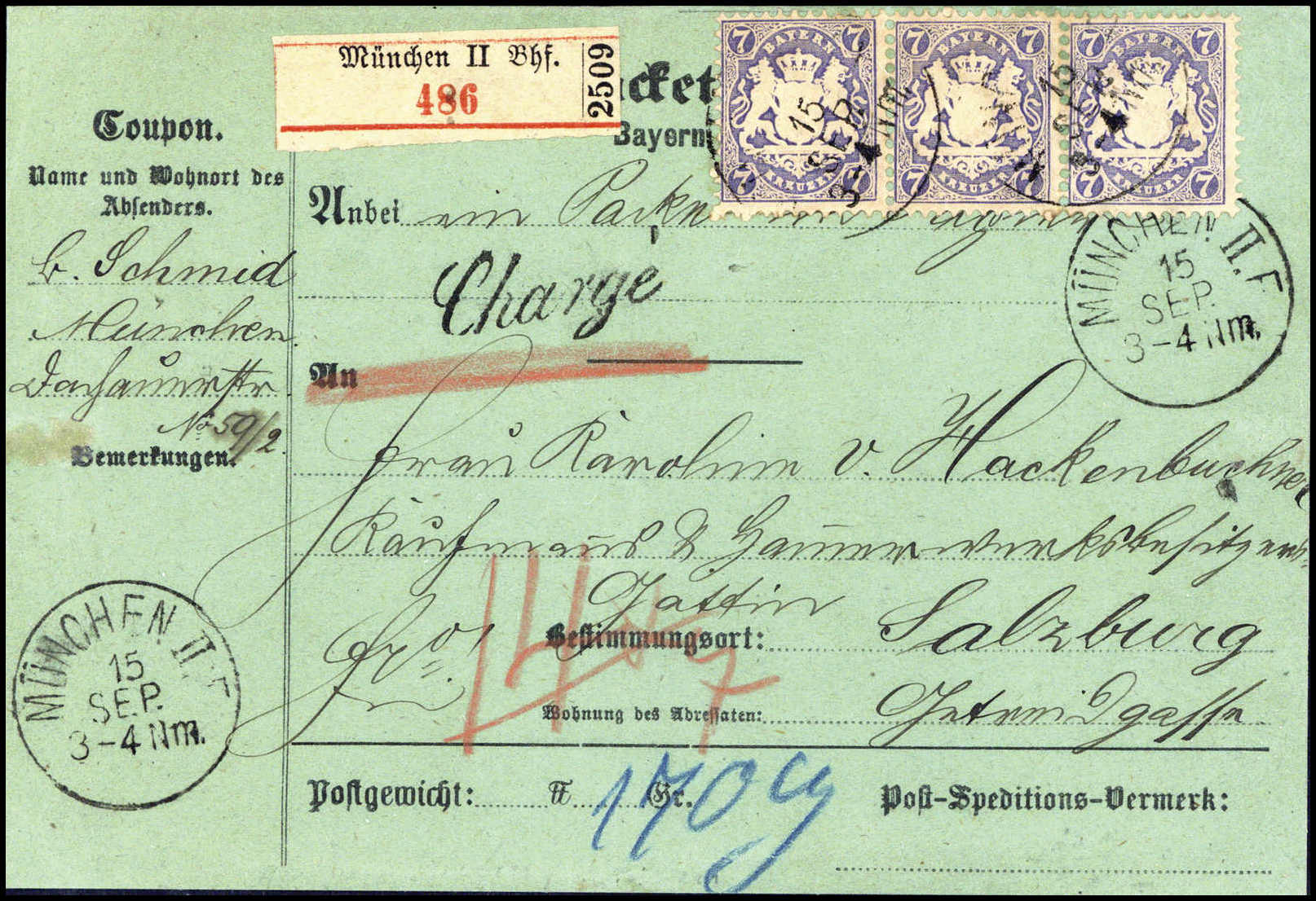 7 Kr., waagr. Kabinett-Dreierstreifen mit K1 MÜNCHEN II. 15/9 (1874/75) auf eingeschr. Paketkarte (min. verkürzt) nach Salzburg mit beiges. L1 "Chargé". Sehr selten. Fotoattest Sem BPP