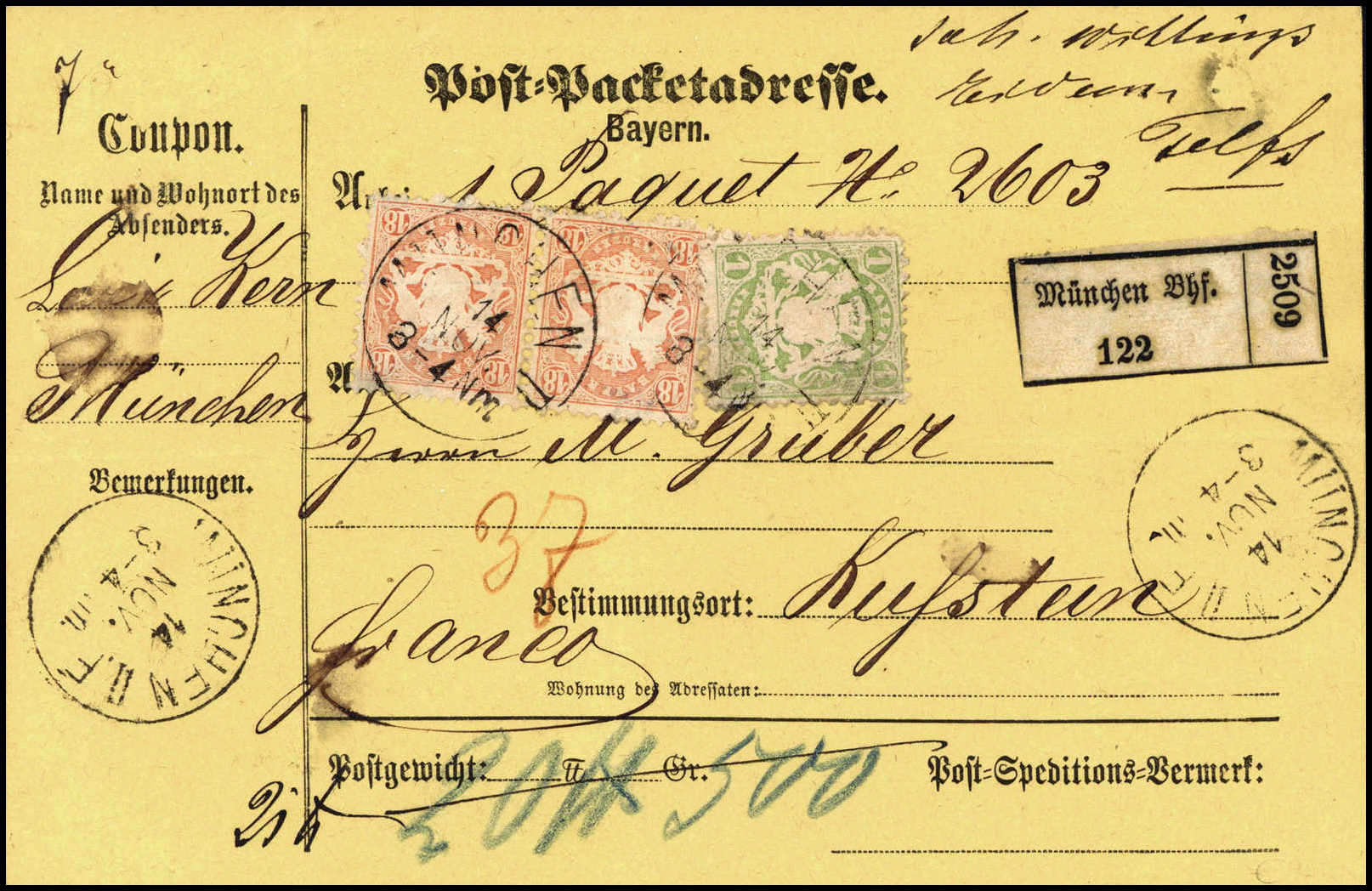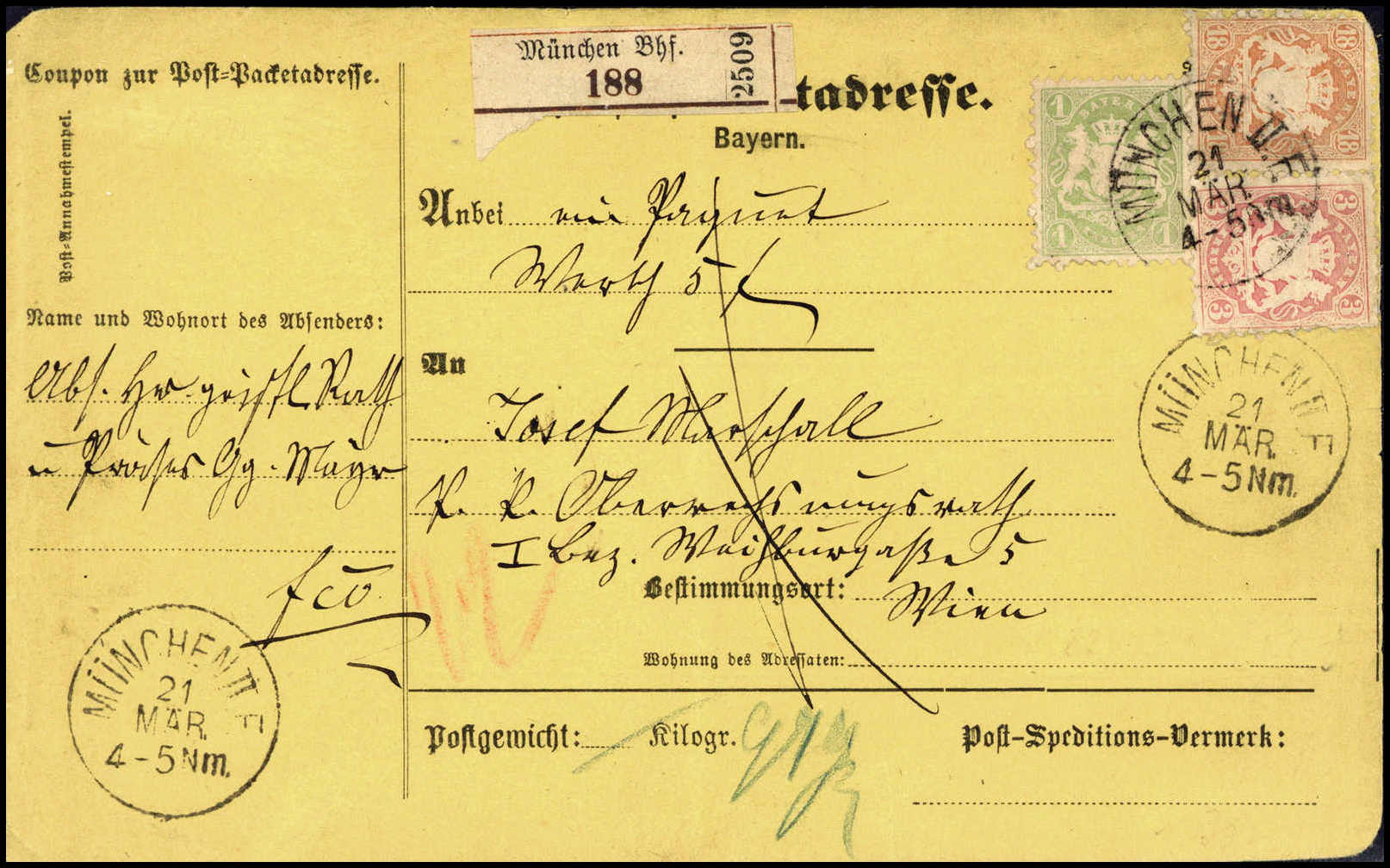 1 Kr. mit 3 Kr. rosa und 18 Kr. ziegelrot auf kpl., gelber Wert-Paketkarte über 5,- Gulden nach Wien, klare Stempel MÜNCHEN II. 21/3. Trotz kl. beförderungsbed. Mängel eine sehr seltene Paketkarten-Frankatur