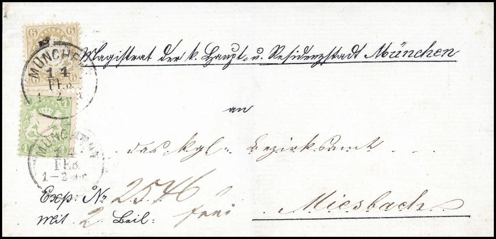 6 Kr., Kabinettstück mit 1 Kr. grün (eckrund) auf aktenfrischem, teils vorgedrucktem Brief von München nach Miesbach