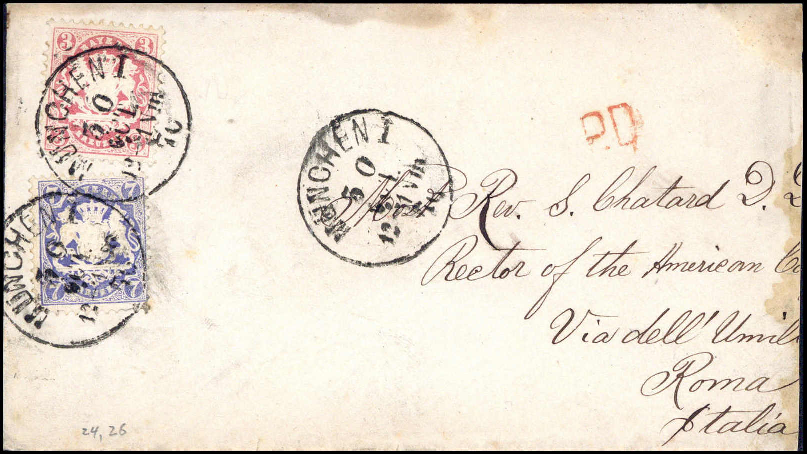 3 und 7 Kr. mit K1 MÜNCHEN I 30/10 70 auf re. etwas verkürztem Brief nach Rom (Beförd.-Spuren)