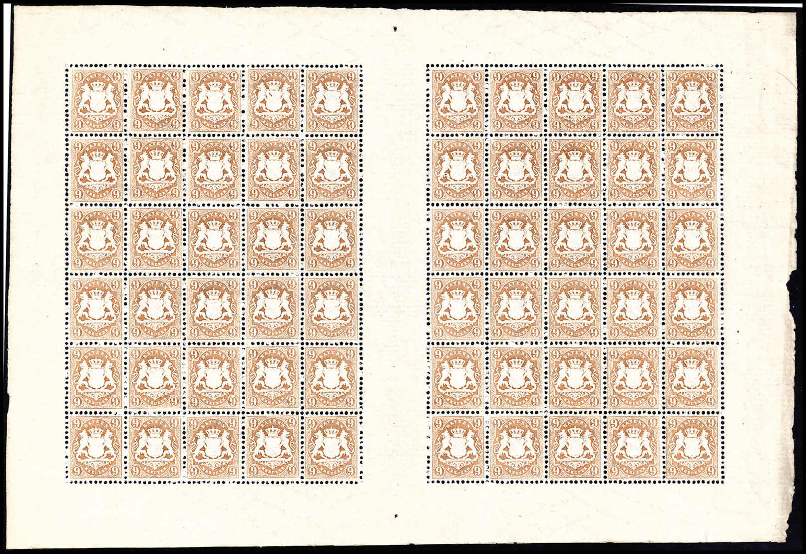 9 Kr. braun, vollständiger, postfrischer Originalbogen von 60 Marken mit sechs Zwischenstegpaaren. Auf den Bogenfeldern 8 und 14 mit zwei markanten Plattenfehlern. Der li. Rand ist teils angetrennt, sonst in perfekter Erhaltung. Es sind