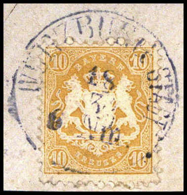 10 Kr. dunkelgelb, Luxus-Briefstück mit schwarzviolettem K1 WÜRZBURG STADT. Katalogpreis: 500,-+