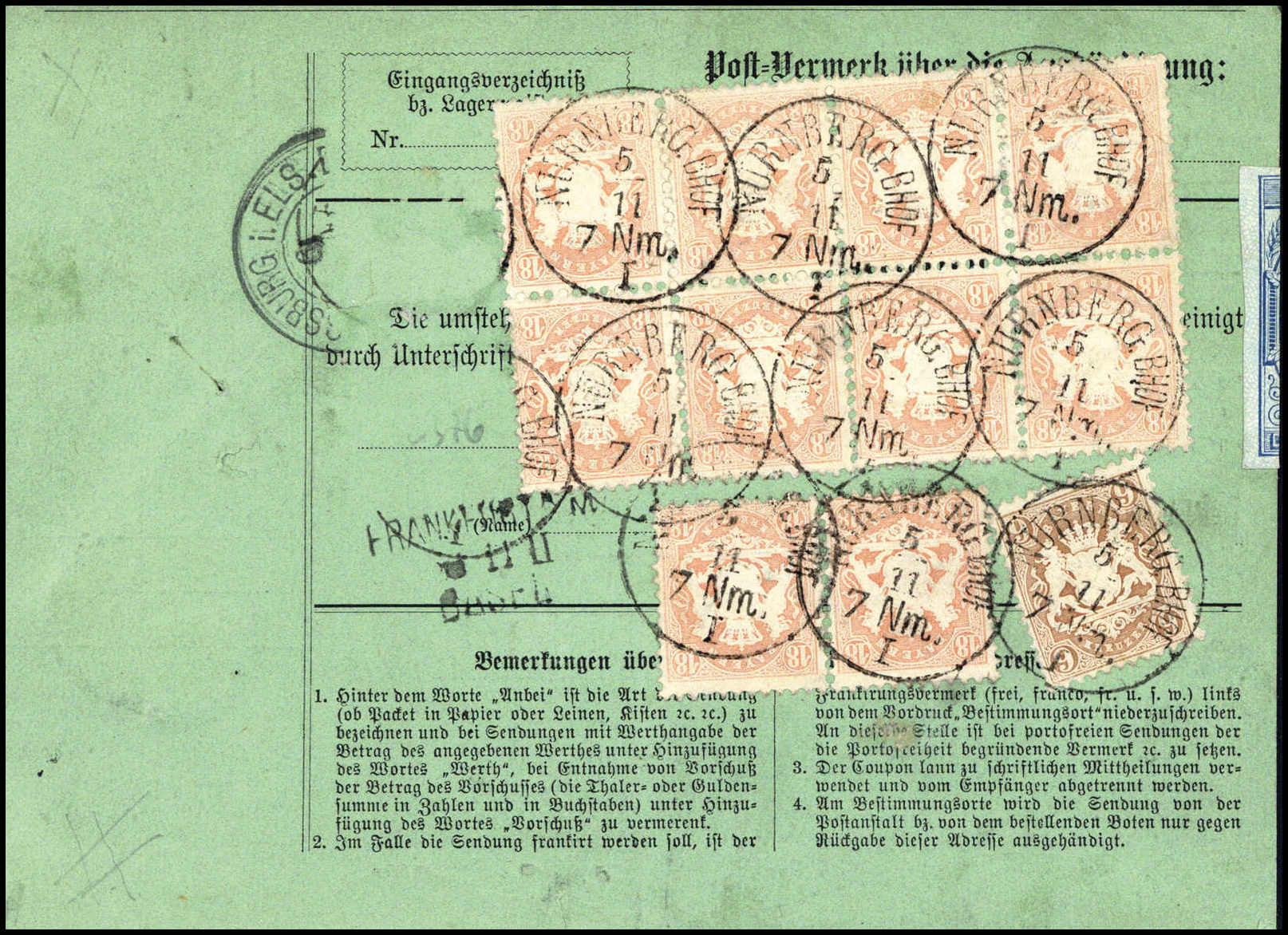 18 Kr., waagr. Achterblock zusammen mit waagr. Paar und 9 Kr. rötlichbraun rs. auf grüner Auslands-Wertpaketkarte über 875,- Gulden nach Paris (zwei weitere Marken entfernt), sauber aufges. K1 NÜRNBERG BHF 5/11 (1874). Ein gebrauchter