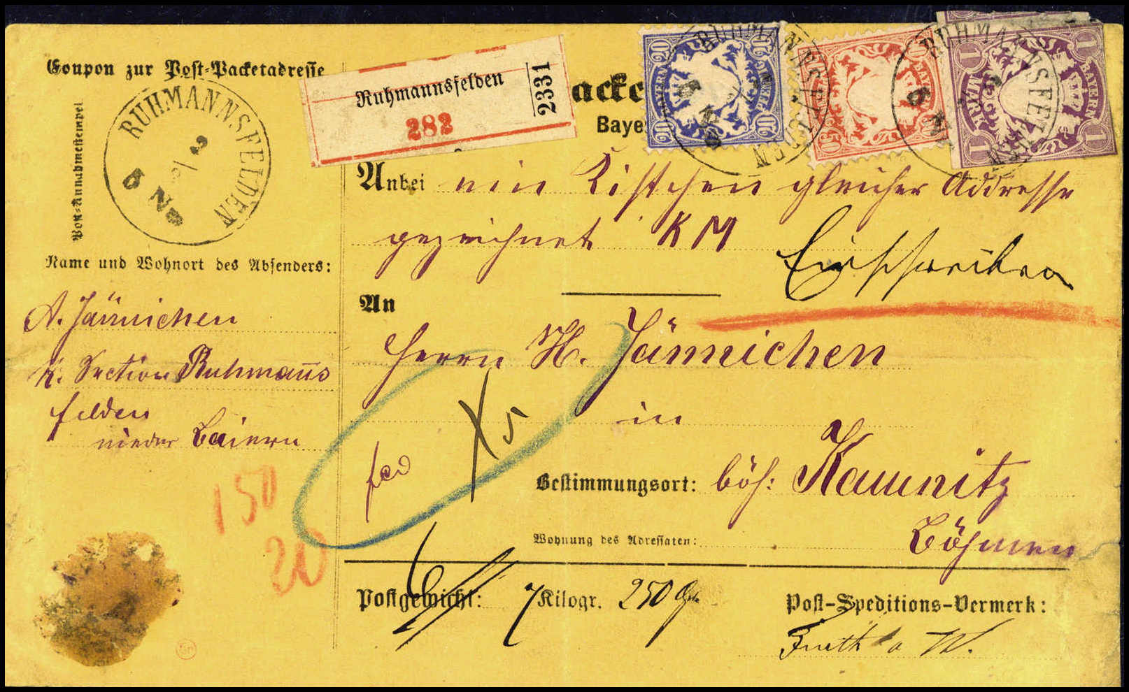 1 Mk. mit 20 und 50 Pfg. auf gelber Paketkarte nach Österreich, klare K1 RUHMANNSFELDEN 2/8. Obwohl etwas fehlerhaft eine interessante und dekorative Karte