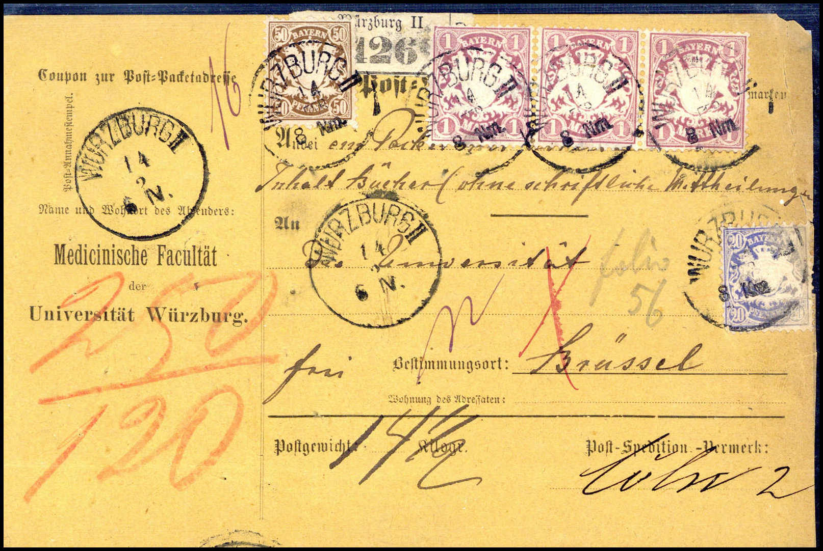 1 Mk., tadelloser waagr. Dreierstreifen mit 20 und 50 Pfg. (erstere kl. Mgl.) auf gelber Paketkarte (1883) von Würzburg n. Brüssel (Beförd.-Spuren)