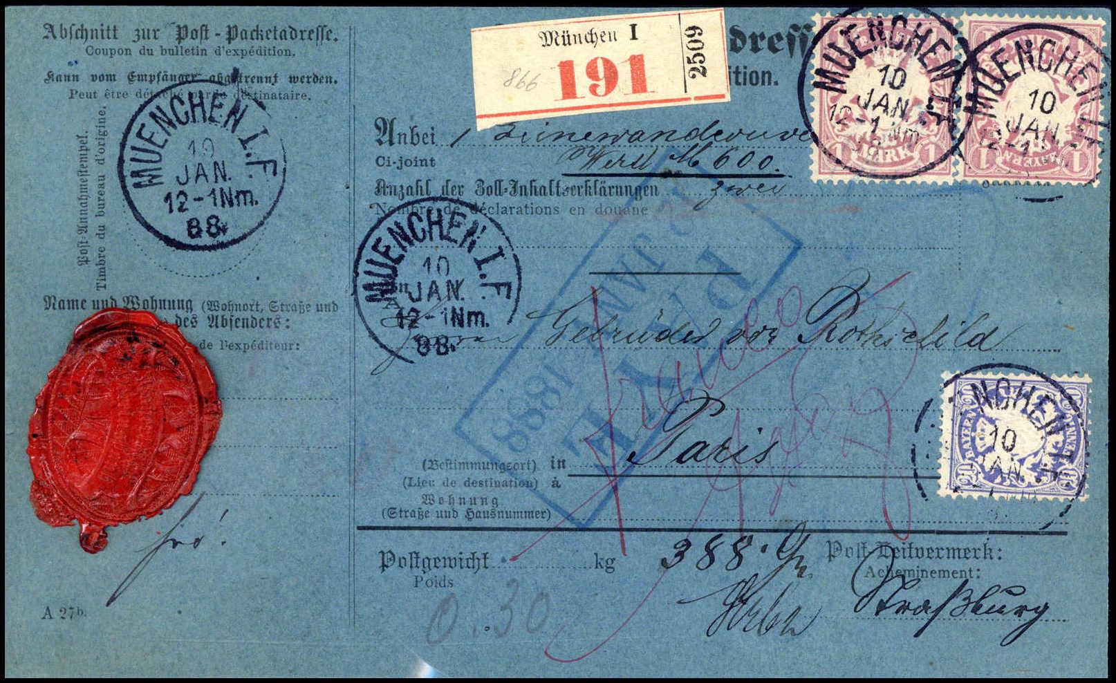 1 Mk., zwei Exemplare mit 20 Pfg. ultramarin auf blauer Wert-Paketkarte über 600,- Mark von München (1888) nach Paris, rs. zwei franz. Steuermarken