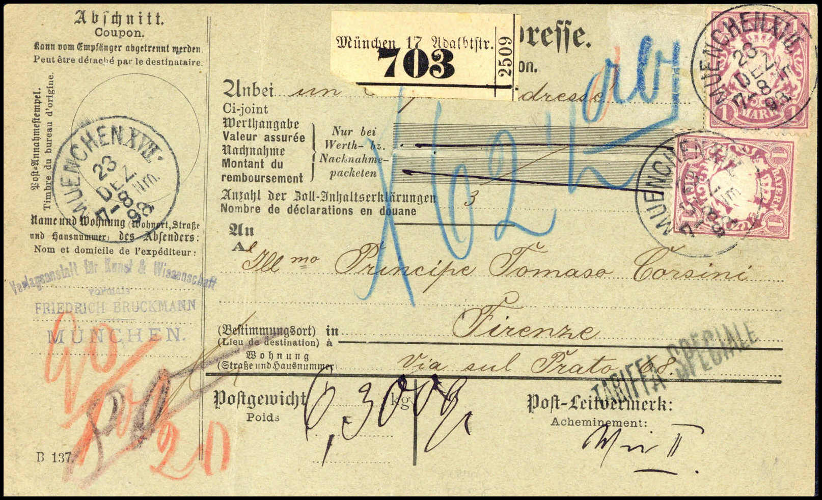 1 Mk., zwei tadellose Exemplare mit zentr. klaren Stempeln MUENCHEN XVII. 23/12 98 als Mehrfachfrankatur auf grüner Paketkarte nach Florenz