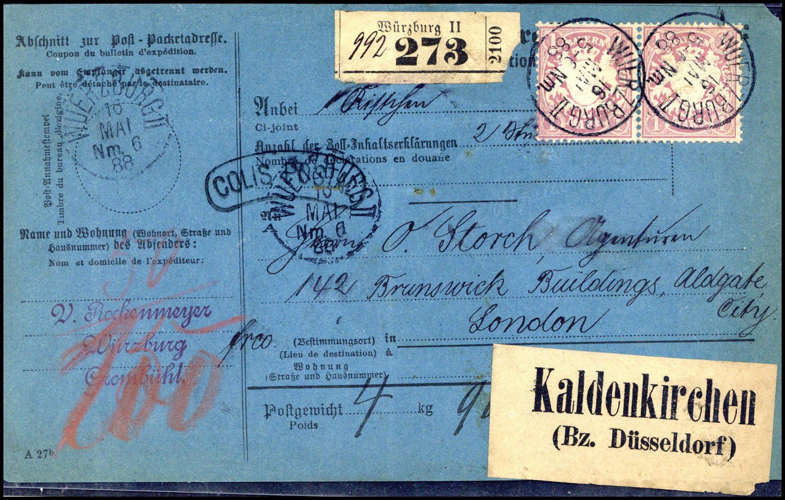 1 Mk., tadelloses, waagr. Paar mit zentr. klaren K1 WUERZBURG II 16/5 88 auf blauer Paketkarte nach London (Beförd.-Spuren). Seltene Mehrfachfrankatur