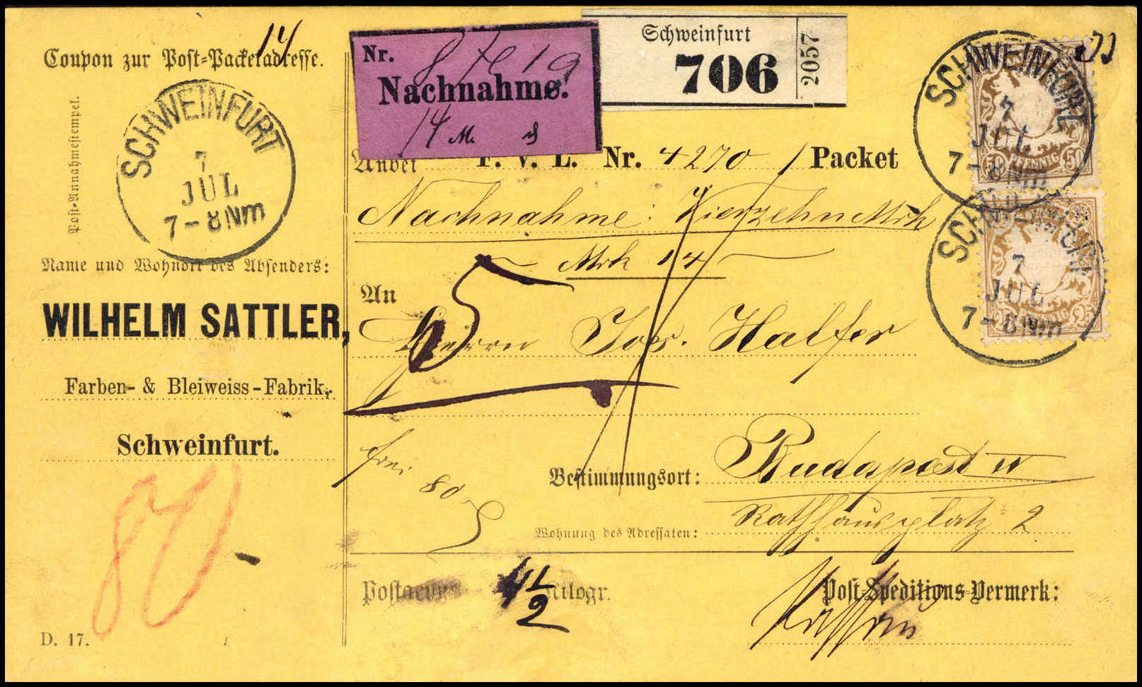25 und 50 Pfg., tadellose Exemplare auf kpl., gelber Nachnahme-Paketkarte mit K1 SCHWEINFURT 7/7 (1883) nach Budapest