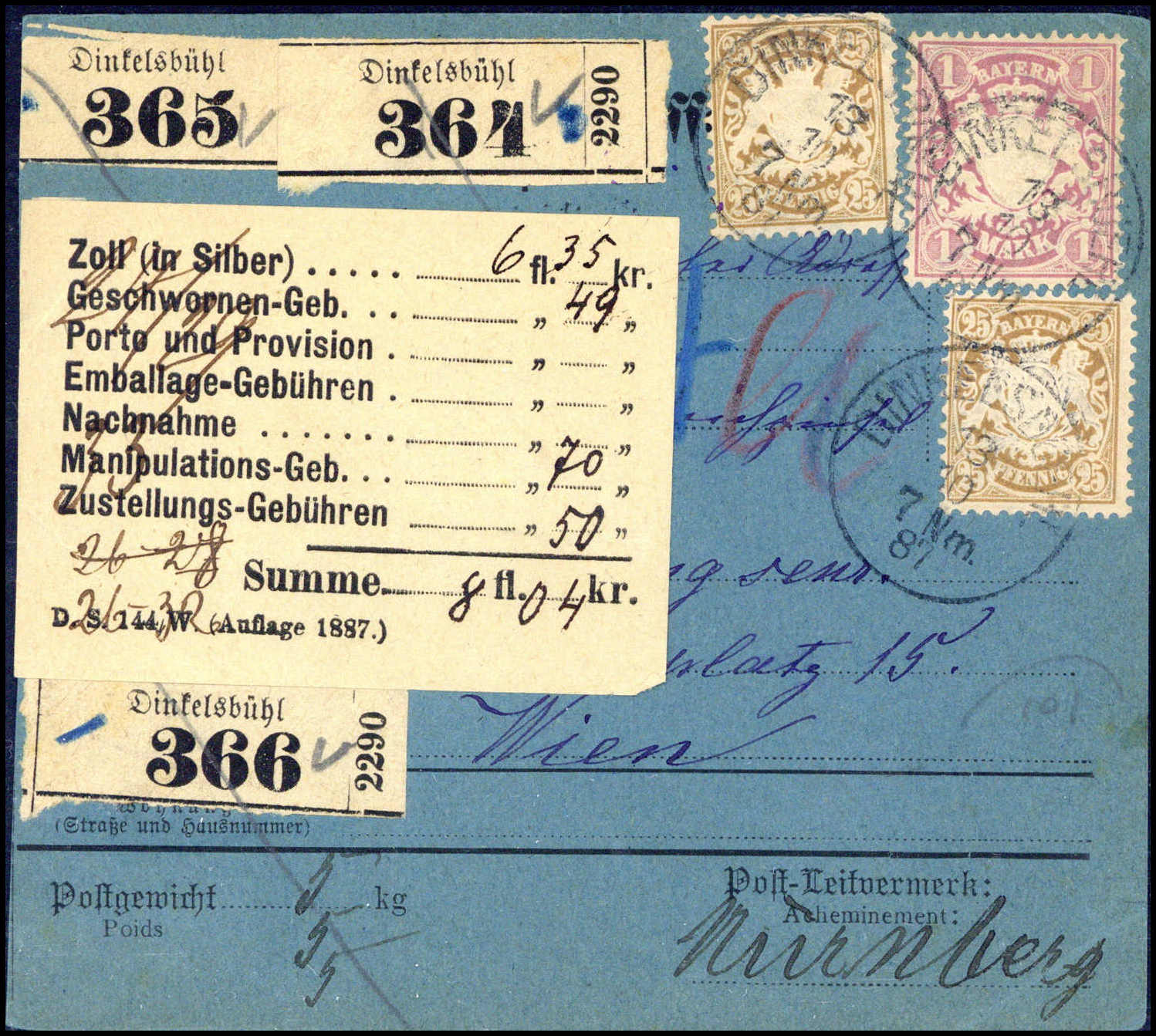 1 Mk. mit zweimal 25 Pfg. (eine Marke etwas bestoßen) auf Sammel-Paketkarte von Dinkelsbühl (13.10.87) nach Wien, Fotoattest Richter