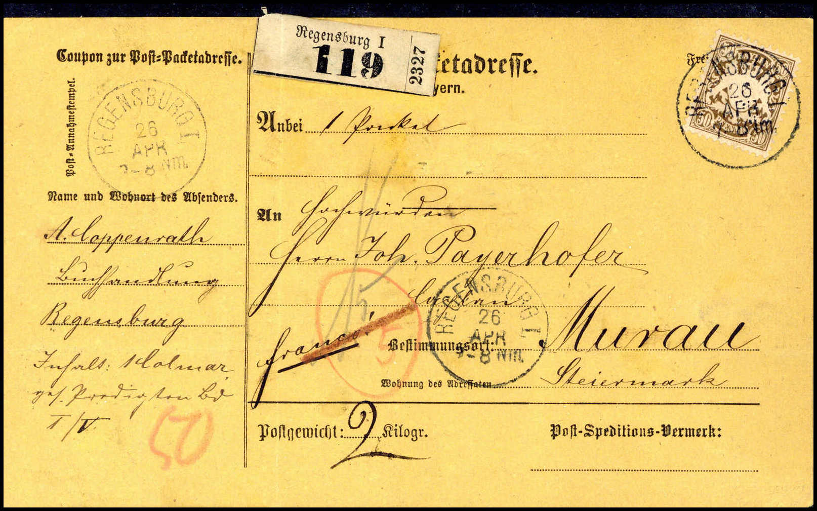 50 Pfg., tadellose Einzelfrankatur mit zentr. Stempel REGENSBURG 26/4 (1880) auf kpl., gef. Paketkarte nach Österreich, Fotoattest Sem BPP