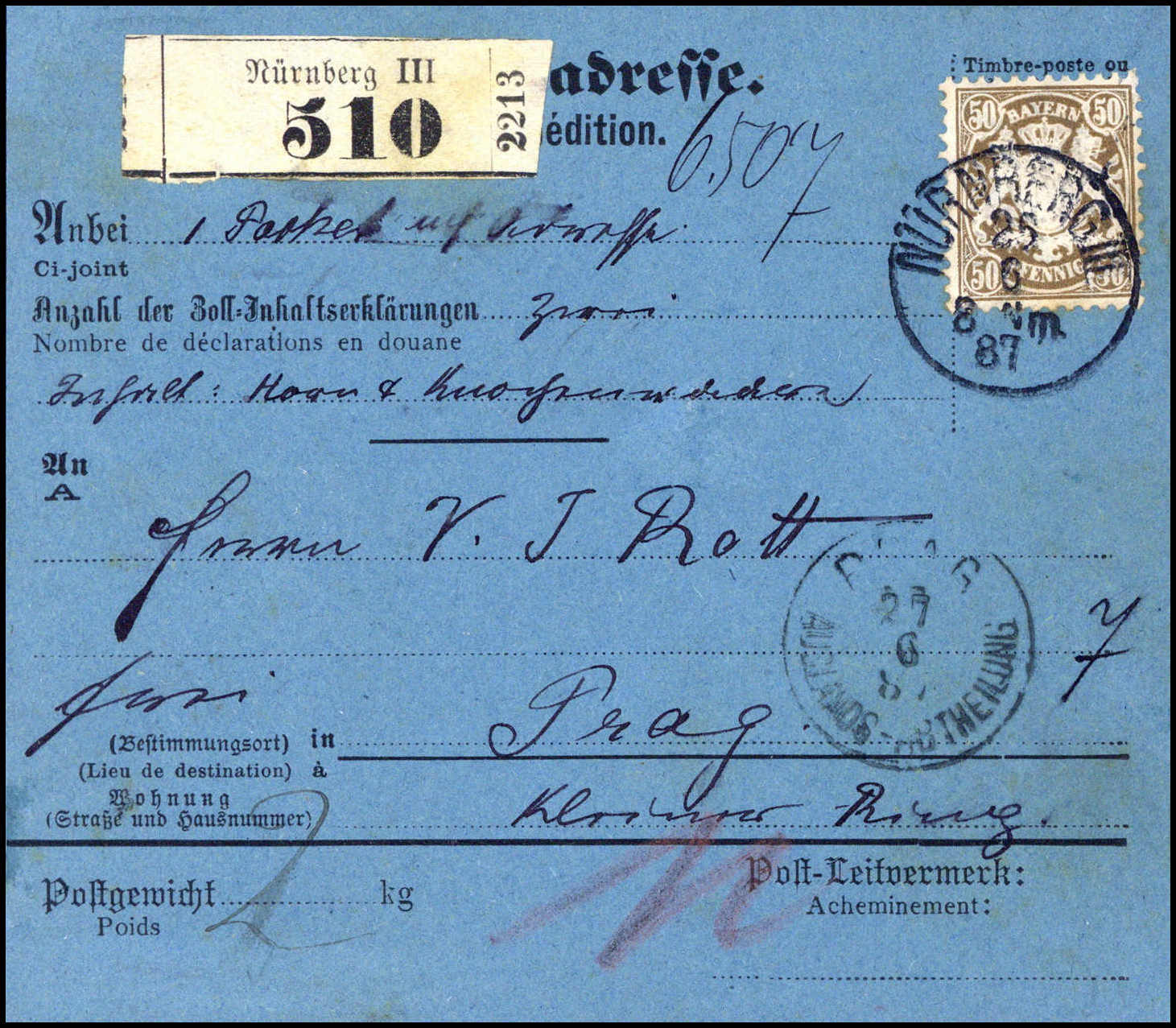 50 Pfg., tadellose Einzelfrankatur auf blauem Paketkarten-Stammteil mit Stempel NÜRNBERG 25/6 87 nach Prag