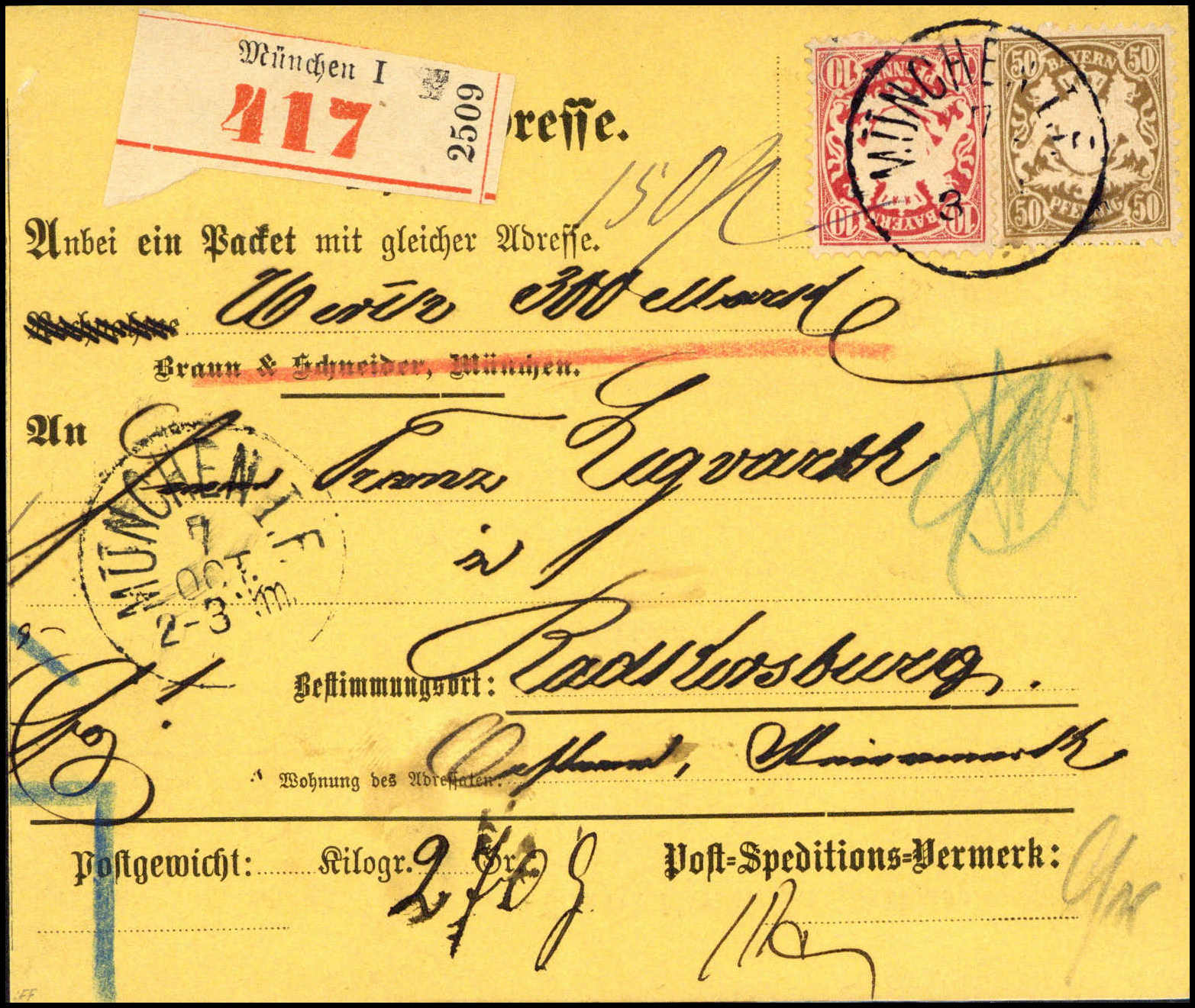 50 Pfg. mit 10 Pfg. auf Wert-Paketkarte (Stammteil) über 300,- Mark mit Stempel MÜNCHEN 7/10 (1881) nach Österreich
