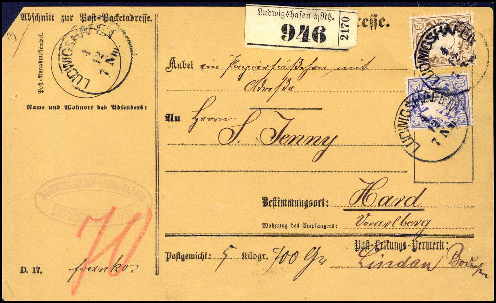 50 und 20 Pfg., tadellose Exemplare mit K1 LUDWIGSHAFEN auf Paketkarte nach Vorarlberg (li. oben etwas abgeschrägt)
