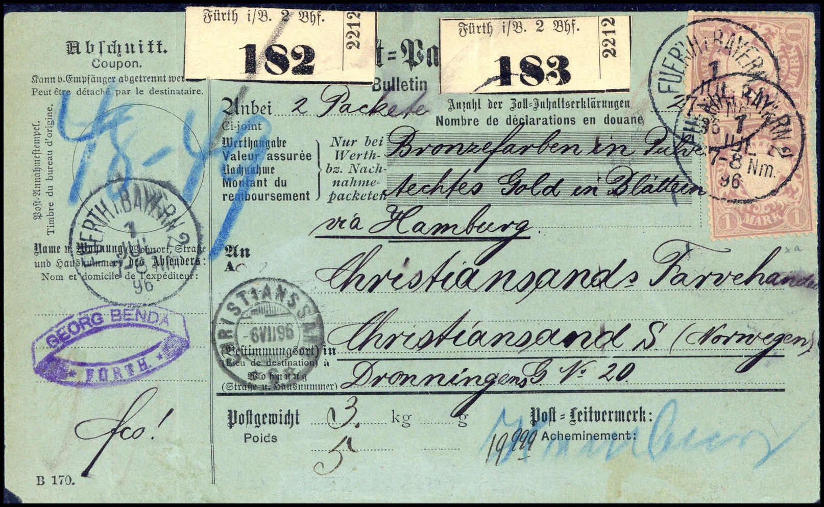 1 Mk., zwei Exemplare auf Sammel-Paketkarte mit Stempel FUERTH 1/7 96 nach Norwegen (kl. Mängel). Als Mehrfachfrankatur mit dieser Destination äußerst selten