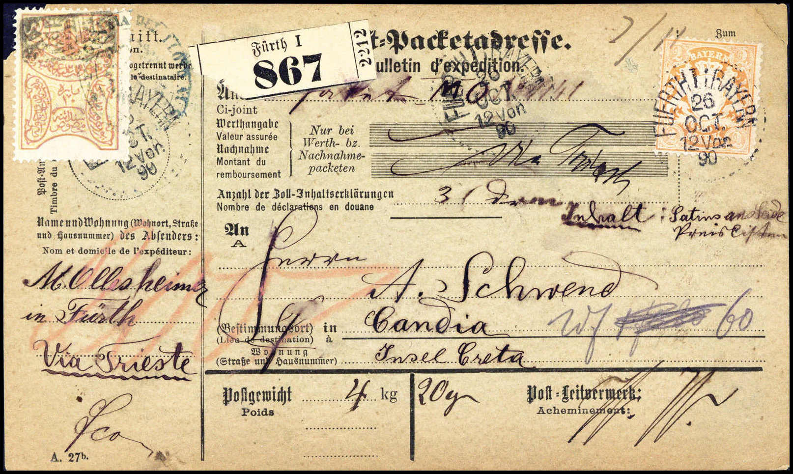 2 Mk. mit Stempel FUERTH 26/10 90 auf kpl. Paketkarte nach Candia/Kreta, li. oben mit türk. Marke nachfrankiert (dahinter abgeschrägte Ecke). Eine seltene Karte