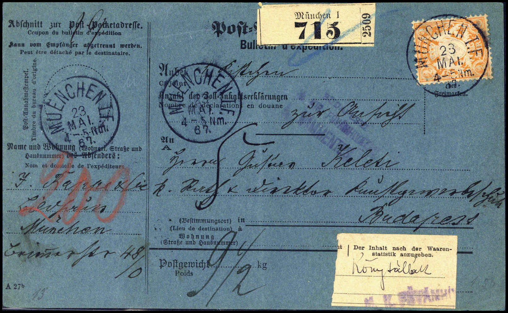 2 Mk. (kl. Zahnspalt), Einzelfrankatur mit klarem K1 MÜNCHEN I.F. 23/5 87 auf schöner, blauer Paketkarte nach Budapest, Fotoattest Helbig BPP