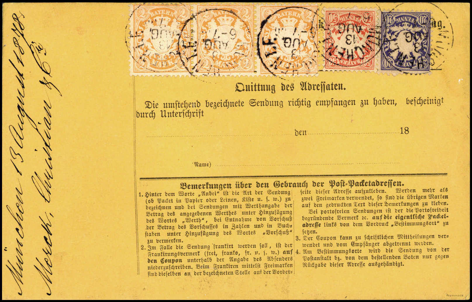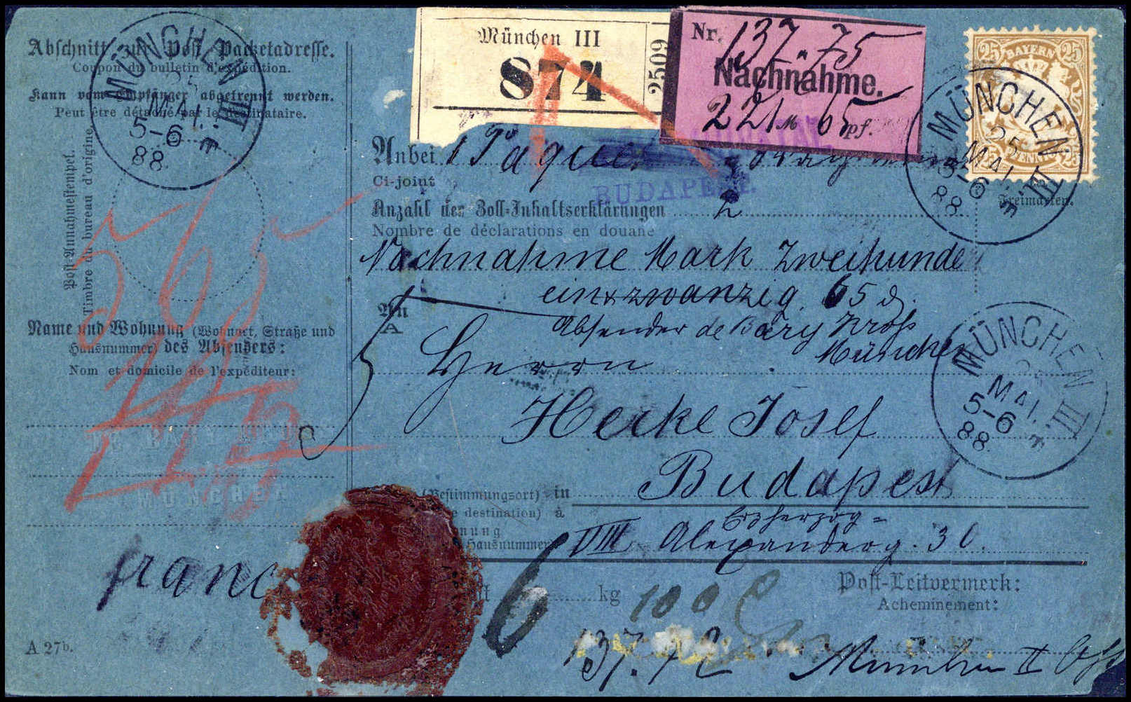 25 Pfg., vs. mit waagr. Paar 2 Mk., 1 Mk. und waagr. Paar 20 Pfg. (einmal Zf.) vs. und rs. auf Nachnahme-Paketkarte mit klaren K1 MÜNCHEN III. 25/5 88 nach Budapest (leichte Beförd.-Spuren). Eine seltene Kombination