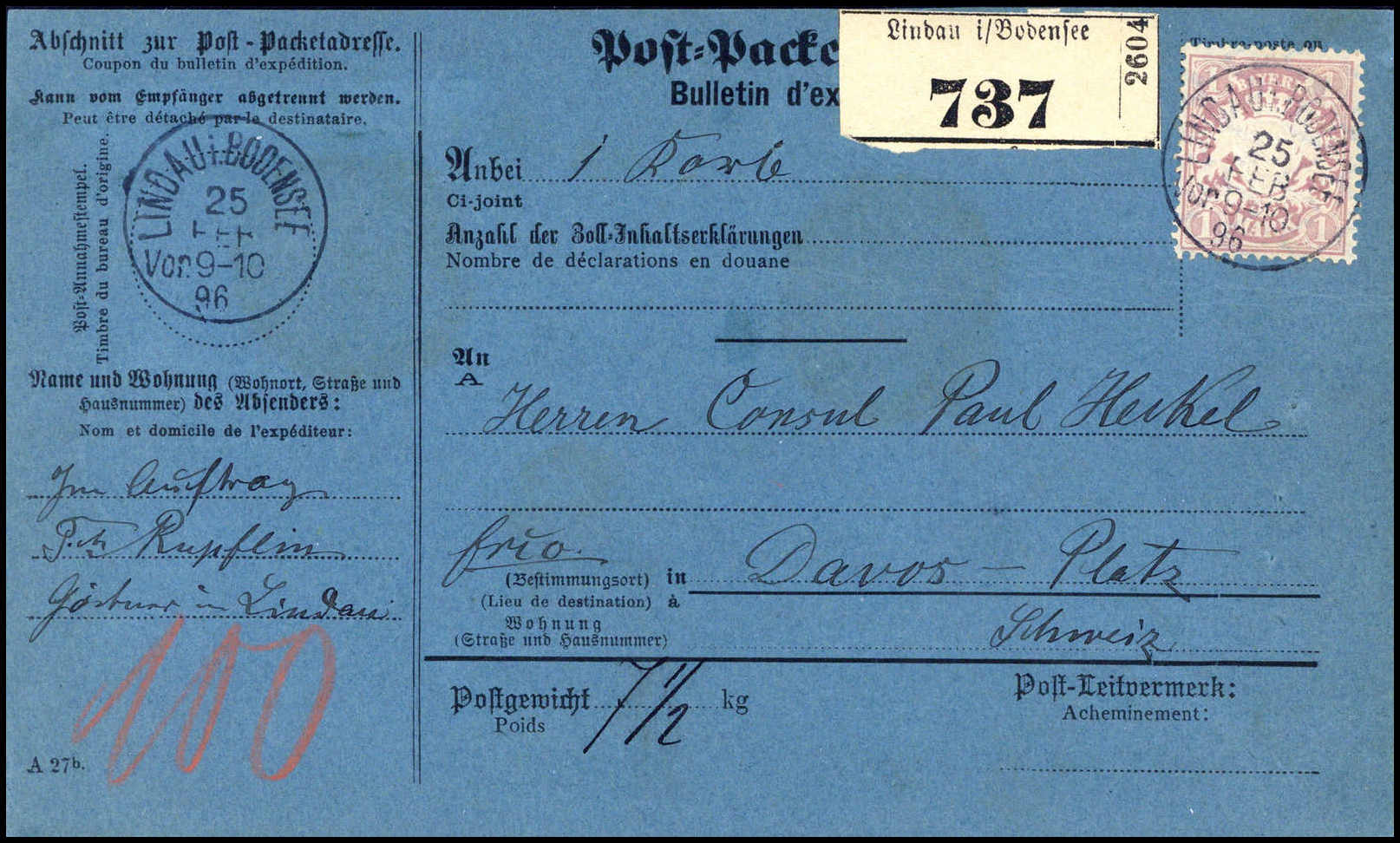 1 Mk., tadellose Einzelfrankatur mit idealem K1 LINDAU 25/2 96 auf blauer Paketkarte nach Davos