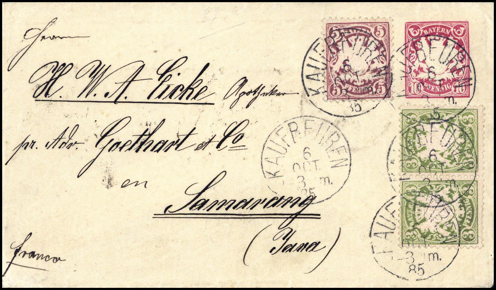 3 Pfg., waagr. Paar mit 5 Pfg. auf Ganzsachenumschlag 10 Pfg. karmin (zweiseitig geöffnet) mit klarem K1 KAUFBEUREN 6/10 (1885) nach Samarang/Java. Sehr seltene Destination in Niederländisch-Indien