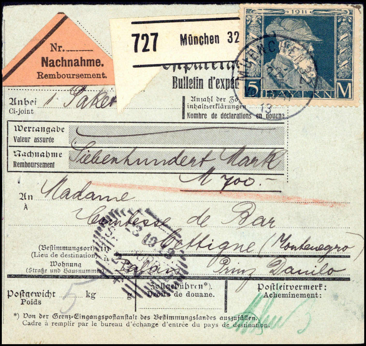 3 und 5 Mk. sowie 50 Pfg. vs. und rs. auf seltener Nachnahme-Paketkarte von München (22.10.13) nach Montenegro